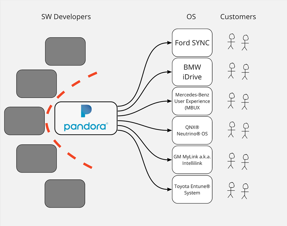 In contrast, if a developer wants to build an app to run in all cars (and arguably Pandora/SiriusXM is the only company that has tried) she would need to build different apps for a dizzying array of different vehicle infotainment systems (some carmakers use more than one!). This is the legacy of the way in which carmakers have approached software and makes it very hard to leverage the creative power that has propelled the tech industry forward. (It’s worth noting that Google and Apple are now both extending their platforms into vehicles which is improving the user experience but ceding control of core functions to outside tech companies.)